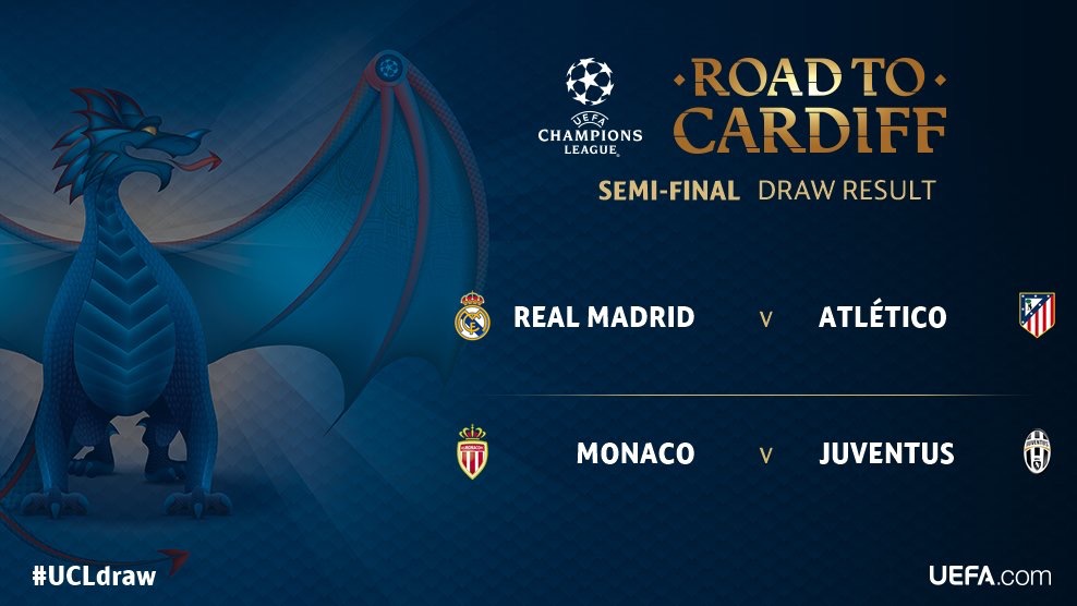Los partidos de ida se jugarán el 2 (Real Madrid vs Atlético) y 3 (Mónaco vs Juventus) de mayo, mientras que la vuelta será el 9 (Juventus vs Mónaco) y 10 (Atlético vs Real Madrid) del mismo mes. Según el sorteo, el ganador del duelo entre la Juve y el Mónaco fungirá de local el próximo 3 de junio, en el Estadio Nacional de Gales, en Cardiff.