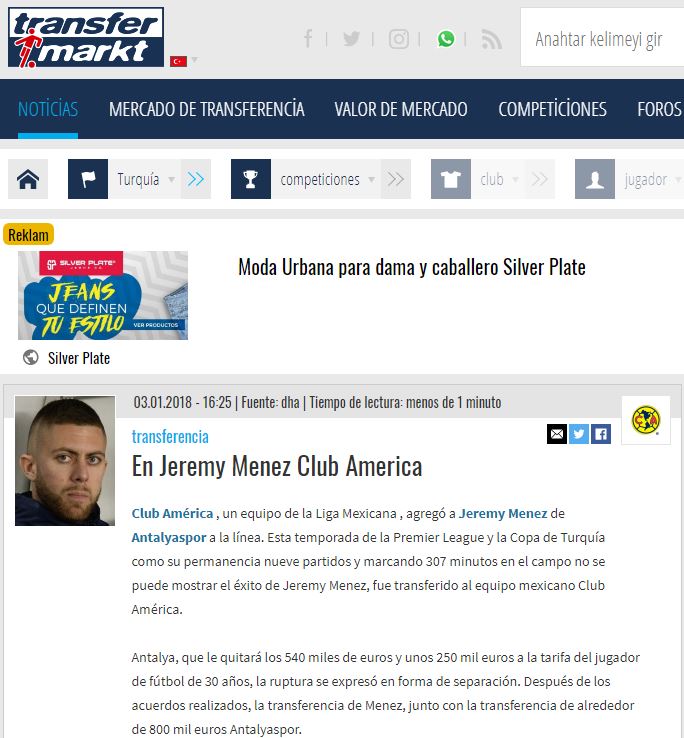 Según medios en Turquía, Jérémy Ménez, dan por hecha la negociación entre el Antalyaspor y el América. Incluso han señalado la cifra que los cremas habrían pagado para que el ex delantero del Milan dejara aquel país. La cuota que se maneja para la liberación de Ménez es de 800 mil euros. Asimismo, el contrato sería por un año, con posibilidad de renovar.