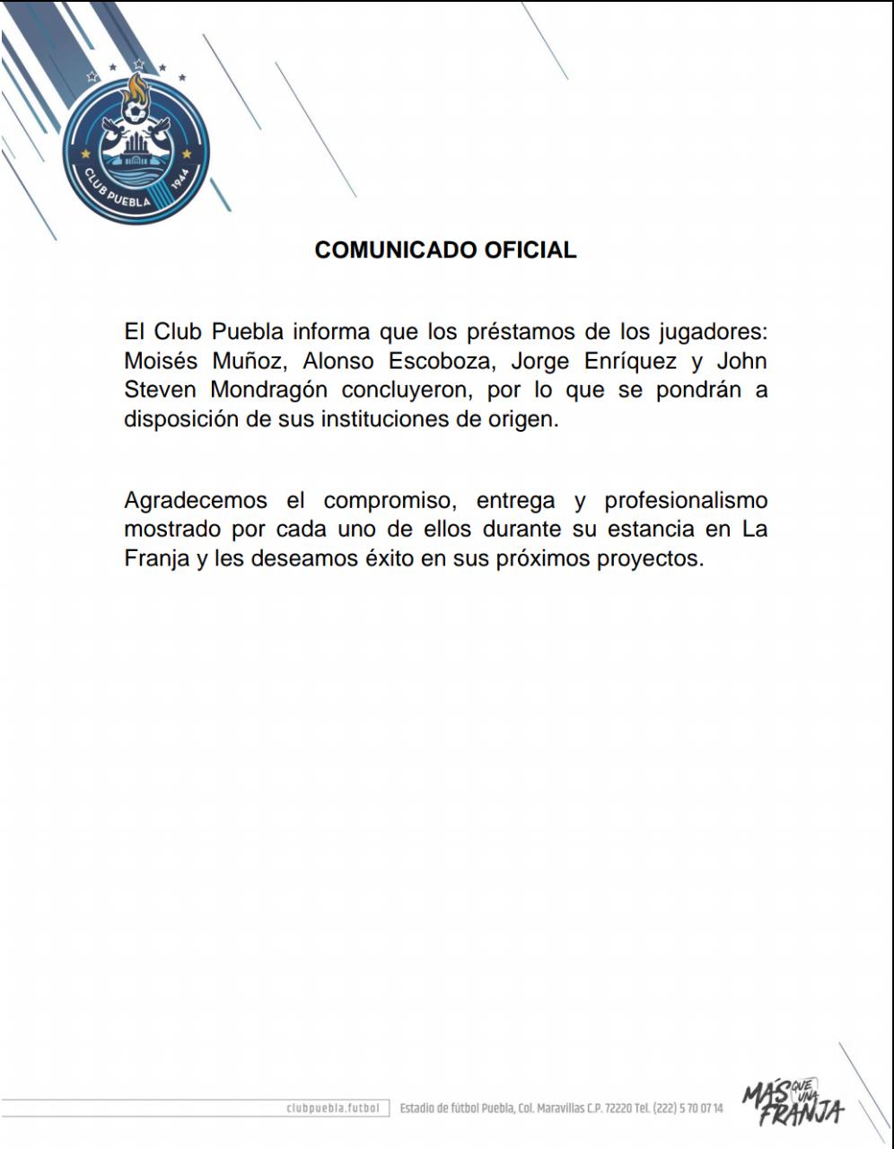 A través de un comunicado, Puebla agradeció a Alonso Escoboza, Jorge “Chatón” Enríquez, Steven Mondragón y el mismo “Moi”, quienes no estarán en la plantilla de la Angelópolis para el Apertura 2018.