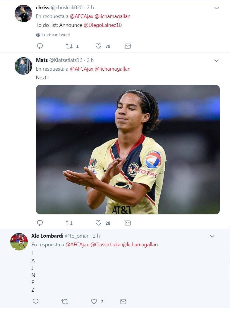 Tras la presentación en redes sociales de Magallán, los hinchas del Ajax respondían con solicitando ya el fichaje de Lainez.