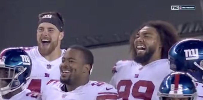 Los Giants estaban abajo en el marcador 7-10 y aunque lograron anotar dos jugadas después, la caída no pasó desapercibida, incluso provocó risa en sus compañeros en la banca.