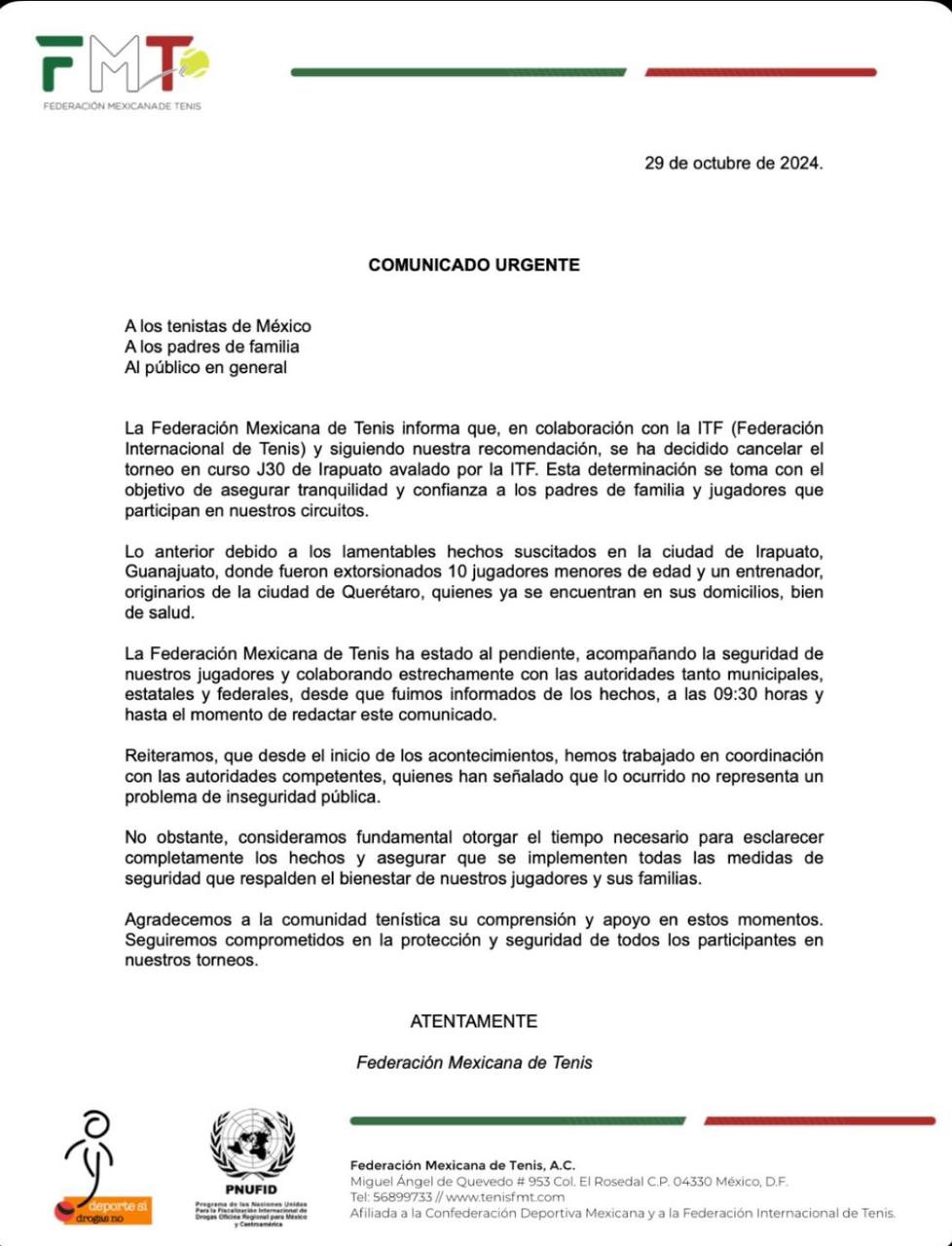 Tras lo ocurrido, la Federacion Mexicana de Tenis confirmó que el torneo a disputarse quedó completamente cancelado y confirmó que fueron 10 jugadores y un entrenador los que sufrieron el secuestro.