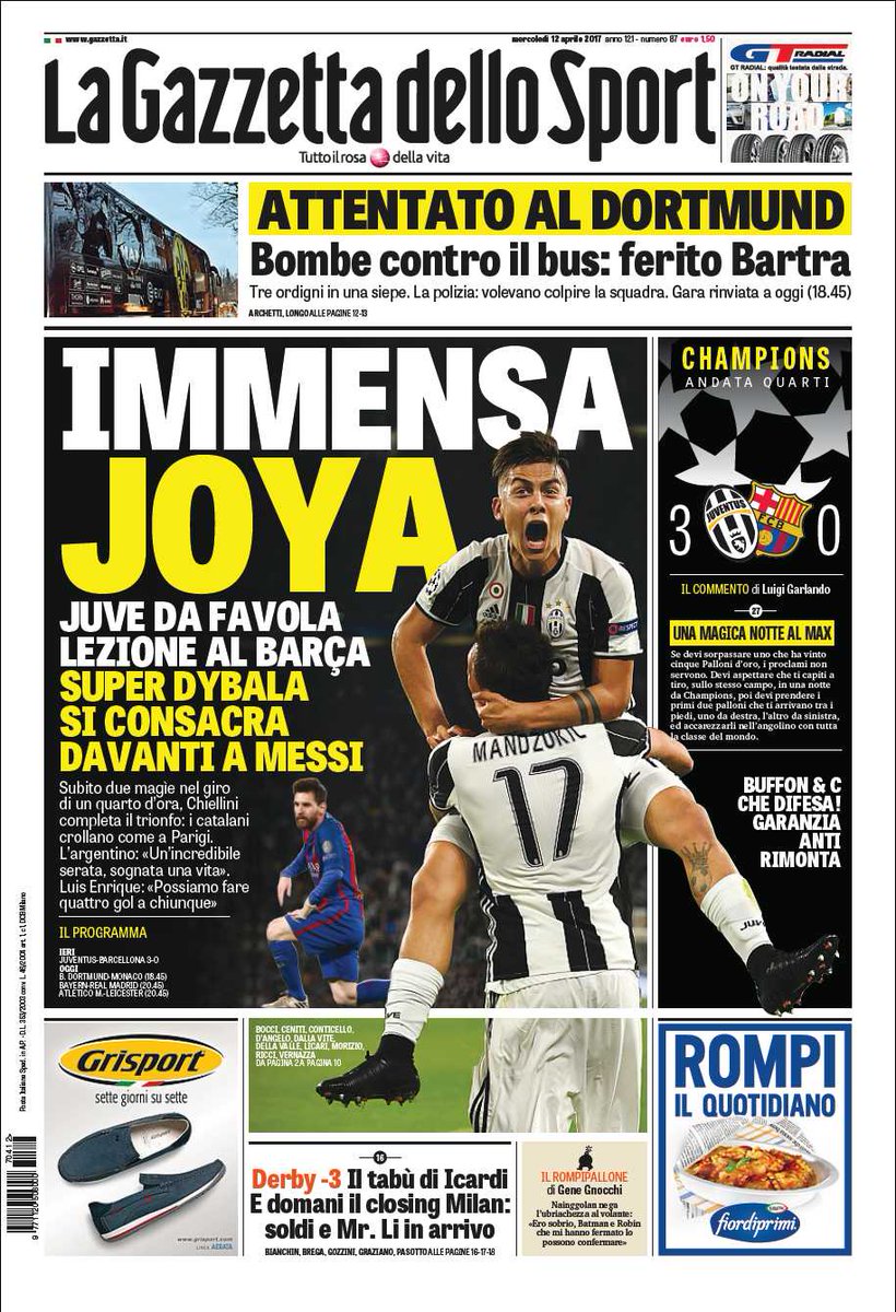 La goleada del Juventus tuvo eco también en los periódicos generalistas, como “La Repubblica”, que titula “El Juventus borra a Messi y Neymar”, o el turinés “La Stampa”, que publicó un “Espectáculo Juventus”.